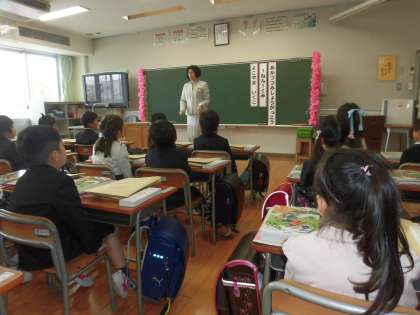 式の後は教室に移動し、各担任の先生のお話を聞きました。明日からは、6年生がしっかり1年生の世話をしてくれます。下の写真は、入学式後の学級指導の様子です。