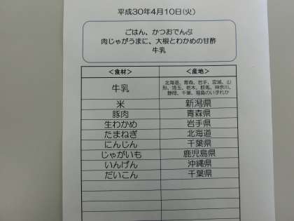 4月10日(火)の給食食材産地について