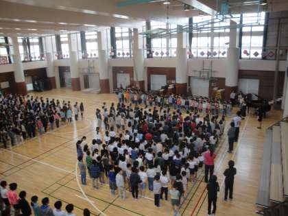 4月16日(月) 1年生を迎える「対面式」がありました。2年生から6年生までが体育館で1年生を迎え、1年生が全校児童の仲間入りをしました。6年生がステージで校歌を歌い、その歌声を聞いた後、全校で校歌を歌いました。体育館いっぱいに、元気な歌声が響きました。