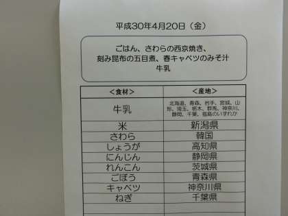 4月20日(金)の給食食材産地について