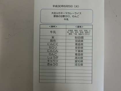 6月5日(火)の給食食材産地について