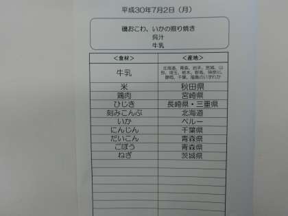7月2日(月)の給食食材産地について