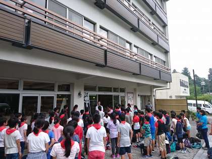 宿舎に着き、開園式を行いました。この3日間の生活が思い出深いものとなるようにと、力を貸してくださる宿舎のみなさんにしっかりとご挨拶をしました。宿舎での集団生活のはじまりです。