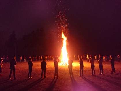 夜のイベントは、キャンプファイヤーです。キャンプファイヤー係のみなさんのチームワークがよく、スムーズに進行しました。風向きが変わり、天気が心配になってきたので、プログラムの順番を何度か入れ替えましたが、互いにフォローし合って運営しました。大きく舞い上がる炎を囲んで歌ったり踊ったり。そして、時間ともに小さくなっていった炎の回りに座り、みんなでこれまでの学校生活を振り返ったり、これからを見つめたり…。一人ひとりの心に残る思い出となることでしょう。