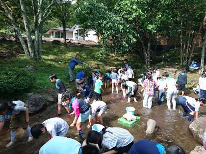 昼食の後は、鱒のつかみ取り体験です。「つかめるかな…。」と、不安そうな表情の子どもたちも、池に入ると歓声あげながら、つかみ取りに挑戦しました。