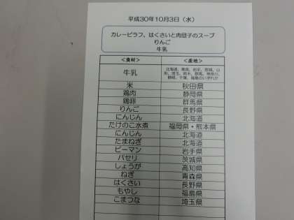 10月3日(水)の給食食材産地について