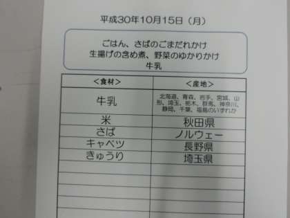 10月15日(月)の給食食材産地について
