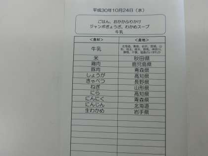 10月24日(水)の給食食材産地について