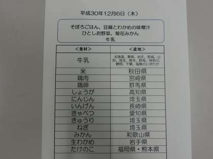 12月6日(木)の給食食材産地について