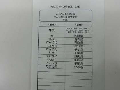 12月10日(月)の給食食材産地について