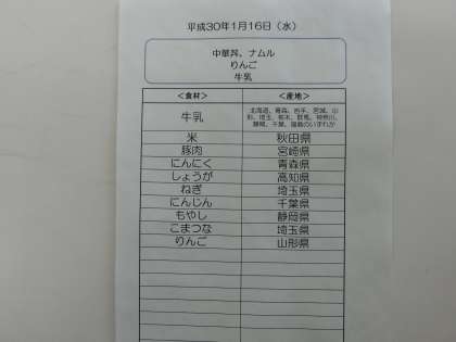 1月16日(水)の給食食材産地について