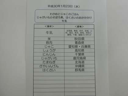 1月23日(水)の給食食材産地について
