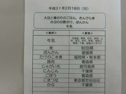 2月18日(月)の給食食材産地について