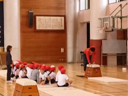 地域の体操クラブのコーチをお招きし、3年生がマット運動や跳び箱運動の基礎となる体の動きを学びました。マットや跳び箱を使った「器械運動」としての学習は、3年生からスタートします。コーチの示範に驚きの声をあげながら、子どもたちも楽しそうにチャレンジしていました。