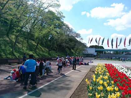 3年生が遠足で、こどもの国に来ました。青い空と鯉のぼり、芽吹きはじめた木々の新緑、色鮮やかなたくさんの花が、子どもたちを迎えてくれました。グループごとに公園内のハイキングに出発します。