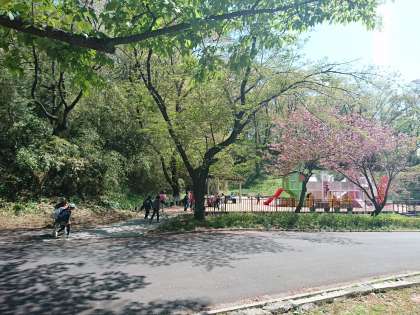チェックポイント回りながら、ローラーすべり台やいかだに挑戦。汗をかいたら木陰でひと休み。心地よい風の中で、春の野山を存分に楽しんでいます。