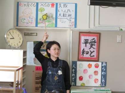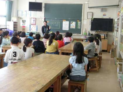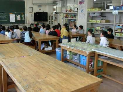 3年生になると図工は、専科の市川先生と図工室で学習をすることが多くなります。はじめての図工の時間は、図工の学習についてと図工室の使い方のオリエンテーションでした。どの子も興味津々で回りを眺めたり、先生の話を真剣なまなざしで聞いたりしていました。先生が「図工でやることは・・・」と尋ねると子どもたちから帰ってきたのは「愛と平和!」でした。