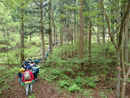 午後の天気が心配なので、予定を早めてハイキングに向かいました。急な予定の変更にも、しっかりと時計を見ながら行動しています。いよいよ森に入ります。声を掛け合って、緑を楽しみながら歩きます。
