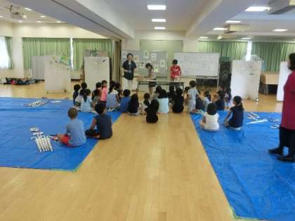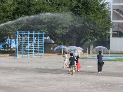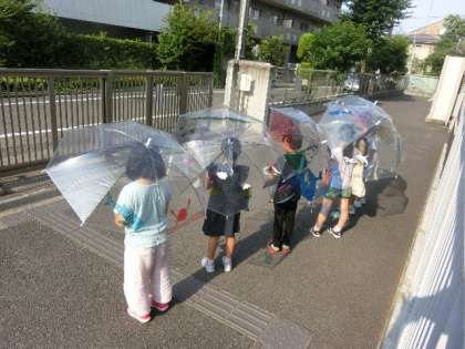 本日は、ビニール傘アートが行われました。透明のビニール傘にマジックで思い思いに絵を描いたり、色を塗ったりしました。出来上がった傘に光がとおってきれいな模様が地面に映りました。使うのが待てない子どもたちは、スプリンクラーの雨で楽しんでいました。