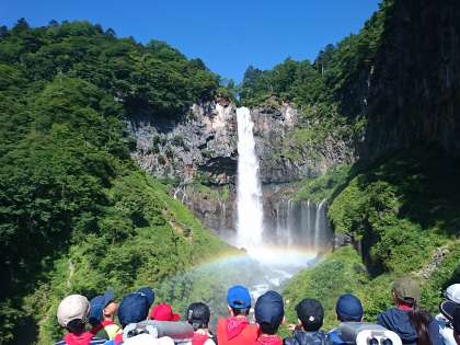 華厳の滝には、大きな虹がかかっていました。こんなに大きな虹がはっきりと見えるのは、めずらしいことです。水量も多く、力強い流れでした。青空に岩つばめが飛び交っています。力強い滝の流れと大きな虹を背景に、クラス毎に記念写真を撮りました。