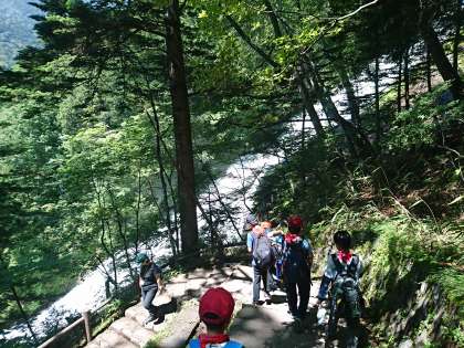源泉から湯ノ湖畔を歩き、湯滝に向かいます。湯滝も水量が多く、観曝台まで水しぶきが飛んで来ました。湯ノ湖から湯滝に沿って降りる階段から見ると、水の流れの速さがとてもよく分かり、子どもたちから驚きの声が聞こえました。