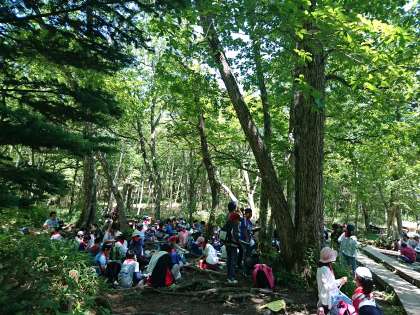 お弁当の時間です。泉門池という小さな池の畔でいただきました。ハイキングがスタートして5分の2にあたるこの場所でお弁当を食べながら、「ハイキングのゴールまで、あとどのくらいあるんだろう。」と想像している子ども。「お腹がすいた。」とたくさん食べる子ども。友達とのおしゃべりで箸が止まりがちな子ども…。子どもたちのいろいろな姿が見える時間でした。