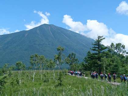 戦場が原のほぼ中央地点。男体山を見上げながら歩きます。今日の男体山には、雲が一つもかかっていません。男体山の特徴である緑と赤の山肌が、とてもきれいに見えました。このあたりからは、疲れた仲間に声をかけなが歩く姿がたくさん見られるようになりました。ハイキングを終えた後は、光徳牧場でソフトクリームをいただきました。