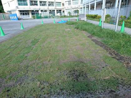 夏休みの間に、校内の環境整備を進めています。学校主事が計画的に作業を進めています。校庭の芝生のメンテナンスも行いました。学校主事が下準備の作業を進めてから、専門業者の方々にバトンタッチ。職員室前や親子山前の芝生が、きれいになりました。