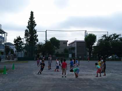サマースクールの一講座として、本校の前校長先生を講師に、早朝の外遊びを楽しみました。2学期がもうすぐはじまるこの時期に、早起きをして体を動かし、生活リズムを整えることもねらっています。前校長先生が、小学生の頃に流行っていた遊びの中から、子どもたちが遊びを決め、自主的にグループをつくって遊びます。早朝の校庭が、子どもたちの活気ある姿でいっぱいになりました。