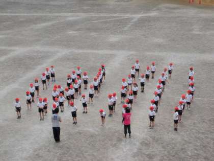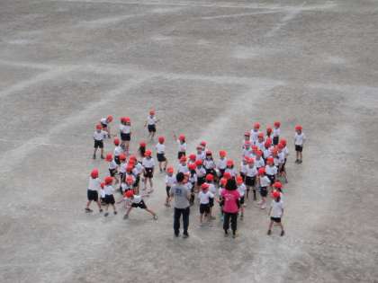 6年の授業を見ていたら、1年合同体育授業が目に入りましたので、ちょっと写真を撮ってみました。初め、ぐちゃぐちゃだった列も、しっかり一列に並べるようになりました。段々ともっとまっすぐな列になることでしょう。