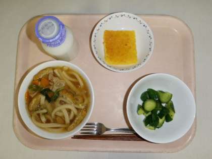 今日の献立は、カレーうどん、牛乳、きゅうりの甘酢漬、キャロットケーキでした。キャロットケーキは、甘さ控えめでとてもおいしく食べられました。