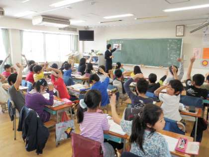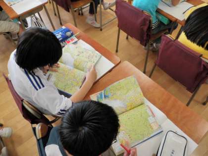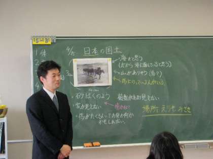 今日の授業は「日本の国土」でした。授業の初めは、地図帳を使った「低い山調べ」でした。地図に慣れるためにとてもいい入り方で、意欲的に取り組んでいました。その後、先生の提示した一枚の写真から、子どもたちが気付いたこと、分かったこと、想像できることを発表していきました。先生の発問から意欲的に答える子どもたちの様子を見て、発問の仕方の大切さを痛感しました。