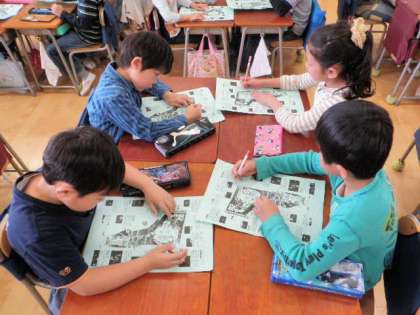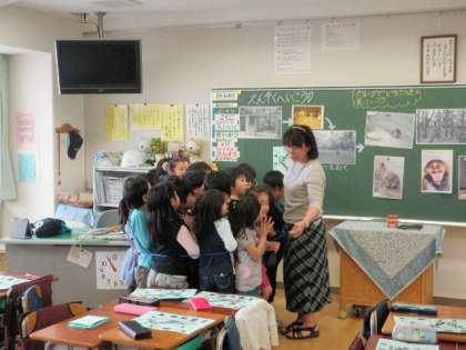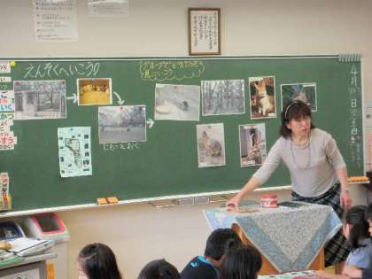 今日の授業は「えんそくへいこう!」でした。2年生は、4月26日(火)井の頭公園へ遠足に行きますが、その事前授業です。先生は、一人から質問があると、その都度全員に注目させ、全員で質問を聞いていました。子どもたちは、先生の話をよく聞き、話の聞き方がとても上手でした。授業の最後には、先生から「動物園を10倍楽しむ方法を教えます。」ということで、象の花子さんの腹囲にどのぐらい子どもたちが入るか、試してみました。子どもたち全員に先生も入ることができるお腹の大きさでした。