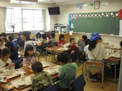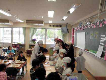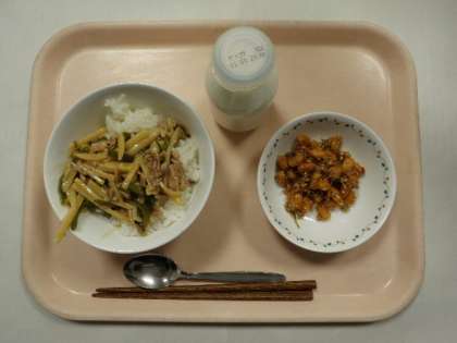 今日の献立は、チンジャオロース丼、牛乳、大豆とじゃこの甘辛揚げでした。昨日から、1年生の給食支援ボランティアが始まりました。各学級3〜4名の保護者の方が手伝ってくださっています。子どもたちと一緒に食べていただきますので、子どもたちの給食時の様子がよく分かると思います。