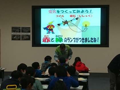 午後は、川崎火力発電所の見学です。発電所の概要や歴史について学んだ後は、コイルと磁石を使って電気を作ってみる実験です。簡易装置を使って、一人ずつ発電にチャレンジしました。