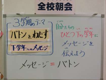 新しい年を迎え、いよいよ3学期がスタートしました。3学期の活動のキーワードは、「バトン」です。バトンを受け取り、渡し、つないでいく。それぞれの学年で様々なバトンがつながれていくことでしょう。