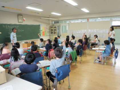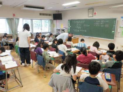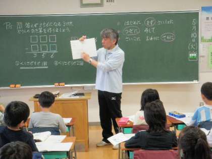 2年から6年までの算数科授業は、少人数授業やT.T(ティーム・ティーチング)指導でも行います。今日の授業はT.T指導で、先生2人で指導していきます。T1が岸塚先生(授業を中心になって進めます。)、T2が吉川先生(児童一人一人の理解を助けます。)でした。君塚先生は、とても優しい語り口で、子どもたちによく考えさせながら、分かったかどうか一つ一つ確認しながら進めていました。間違ってしまった発言もその子を大切にして、上手に次の発問につなげていました。