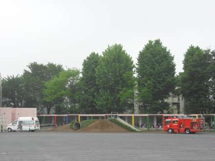 雨の降る中でしたが、渡り廊下で、世田谷消防署上北沢出張所と宮の坂出張所から来たポンプ車と救急車をよくみて描きました。