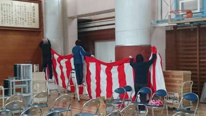 体育館に紅白の幕を張り、式場準備の取りかかります。幕が張られると、体育館の風景も雰囲気も一変します。明後日は、ここが卒業生たちの巣立ちの舞台になります。