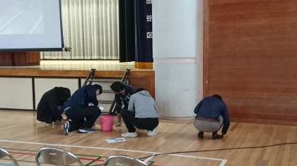 子どもたちが歩く動線に沿って、床を磨きあげています。卒業生がこの階段をのぼったところで立ち止まり、担任から小学校生活最後の呼名を受けます。一人ひとりが気持ちよく階段をのぼって行けるように、気持ちを込めて磨いています。