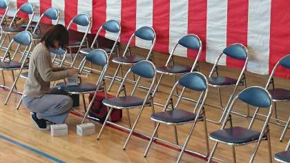 子どもたちの急な体調変化に迅速に対応できるよう、式場の数ヵ所に緊急対応セットを配置しています。養護教諭が、セットの内容を再点検し、配置を終えました。