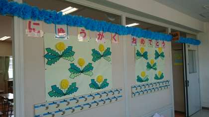 1年生の教室前の廊下を装飾しました。少し緊張して教室の前まで来た1年生の気持ちが、ふわっと軽くなるように。そんな思いを込めた掲示です。