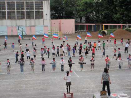 赤堤小学校伝統の赤小パレードの練習です。6年生にとっては、小学校最後の運動会でのあこがれの演奏です。演奏しながらいろいろな隊形に変えていきます。最後の詰めの練習、一心に取り組んでいました。