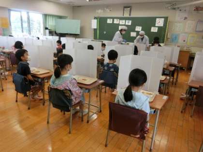 6月22日(月)から給食が再開しました。「給食だより」6月号でご案内のとおり、新型コロナウイルス感染症拡大防止の観点から、給食開始当初の1週間は、品数の少ない簡易給食を提供しております。世田谷区教育委員会の方針に基づき、このような対応させていただいております。提供する給食の総カロリーはこれまで通りの規定量を保ち、一品に含まれる食材を通常よりも多くして栄養のバランスを考慮するとともに、個包装にするなど容器も工夫して給食の準備を行っております。また、給食開始当初は、児童が給食当番を行うことなく、担任がすべての児童の給食を配膳しますので、安全かつ衛生的に配膳ができるよう配慮しおります。児童もパーテーションを設定して配膳を待ち、いただく直前マスクを外すなど、新たな生活様式の中での給食となります。児童がこの様式に慣れた第2週目からは、次第に品数を元の給食と同様に戻してまいります。
