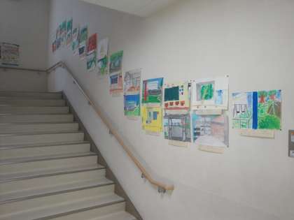 6年生の図画工作では、「わたしのお気に入りの場所」というテーマで、水彩画を描いています。学校の中で、自分の「一番のお気に入りの場所」を画用紙にスケッチし、水彩絵の具を使って表現します。しかし、今年度のこの学習は、例年とはひと味違っています。「わたしのお気に入りの場所」のテーマに、「1年生に紹介したい…」という言葉がついています。小学校生活最後の1年を迎えた6年生が、これまで過ごしてきた校舎や校庭、体育館など校内のさまざまな場所を見つめ、その場所にまつわる思い出などを振り返りながら、学校生活がスタートしたばかりの「1年生」に紹介したい場所を描いています。完成した絵は、1年生が昇降口から教室まで上がるときに使う階段に展示してあります。1年生に是非、見てもらいたい…。ここにも、6年生から1年生への思いが表現されています。
