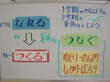 7月31日(金)第1学期の終業式がありました。通常ならば4か月ある第1学期が、今年度は約1か月(6週間)。学校再開後の、子どもたちと教職員の共通目標は「もっと楽しい学校をつくる」ことです。そのために、第1学期は、新しい仲間、新しい教室、新しい先生…そして、新しい生活様式とルールに「なれる」ことを重点としてきました。学校再開後6週間でこれらに「なれる」ことで、第2学期に「もっと楽しい学校をつくる」ための具体的な取り組みの基盤をつくりたいと考えてきました。保護者の皆さまのお力添えと、教職員と子どもたちとの取り組みの中で、「なれる」を重点とした教育活動を進めることができました。この取り組みを、2学期の教育活動につなげて行きたいと考えています。そのために、終業式では、校長から子どもたちに、夏休みのテーマは「つなぐ」であると話しました。そして、1学期の取り組みを2学期につなぐために、子どもたちには、夏休みを、「ゆったり・のんびりと過ごすこと」と「しっかり・ばっちりと過ごすこと」について話ました。まずは、気持ちを和らげる時間をつくってほしい…。そして、決めたことにしっかりと取り組み、ばっちりとやり遂げる時間をつくってほしい…。そのバランスを大切に過ごしてほしい。これが、校長から子どもたちへの終業式でのメッセージでした。(写真左)