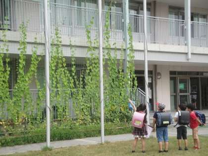 下校時、職員室前のゴーヤの蔓にミンミン蝉が止まって、夏らしい声を響かせていました。子どもたちがそれを見上げています。(写真右)普段の終業式には、アブラ蝉の声が聞こえますが、今年の終業式は、既にミンミン蝉が鳴いています。第2学期も、子どもたちと教職員が一緒になって「もっと楽しい学校づくり」に力を注いでまいります。皆さまのお力添えを、どうぞよろしくお願いします。