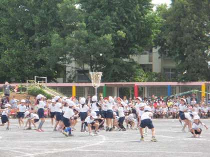 1年生の団体競技は「レッツゴー!玉入れ」でした。赤白白熱し、3回戦でやっと決着がつきました。どの子も一生懸命投げていました。