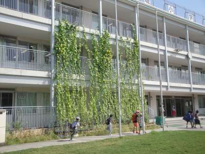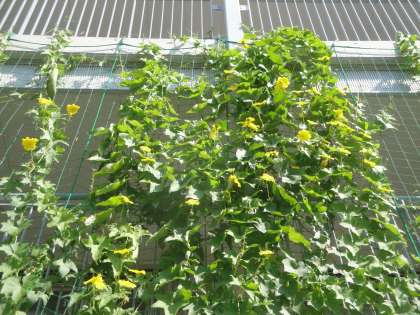 8月も後半に入りましたが、まだまだ暑い日が続いています。そんな中、今年も「緑のカーテン」が高く高くのびています。校舎の壁面に張られたネットを、蔓が力強くつかみ、上へ上へとのびています。黄色い花もたくさん咲いています。緑のカーテンに覆われた壁面は彩りがきれいで青空に映えています。カーテンの後ろに回ると、何とも涼しげな感じがします。様々な規制のある夏ですが、第2学期には、夏休みの間に、この蔓のように少しずつ少しずつのびていった子どもたちに会えることを、楽しみにしています。学校では、子どもたち一人一人が目標をもって元気よく登校できるよう、第2学期の準備を進めてします。