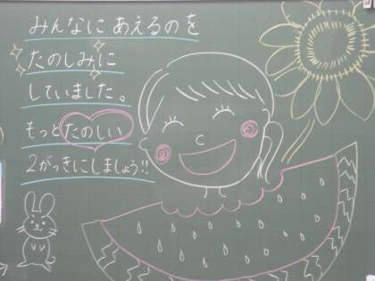 右の写真は、今朝、教室の黒板に教員が描いたアートです。全教職員が、この絵と同じ気持ちで、子どもたちを迎えました。第2学期も、新型コロナウイルス感染症への対策を十分に行いながら、内容や方法を工夫し、可能な範囲で様々な活動が行えるよう、力を尽くしてまいります。